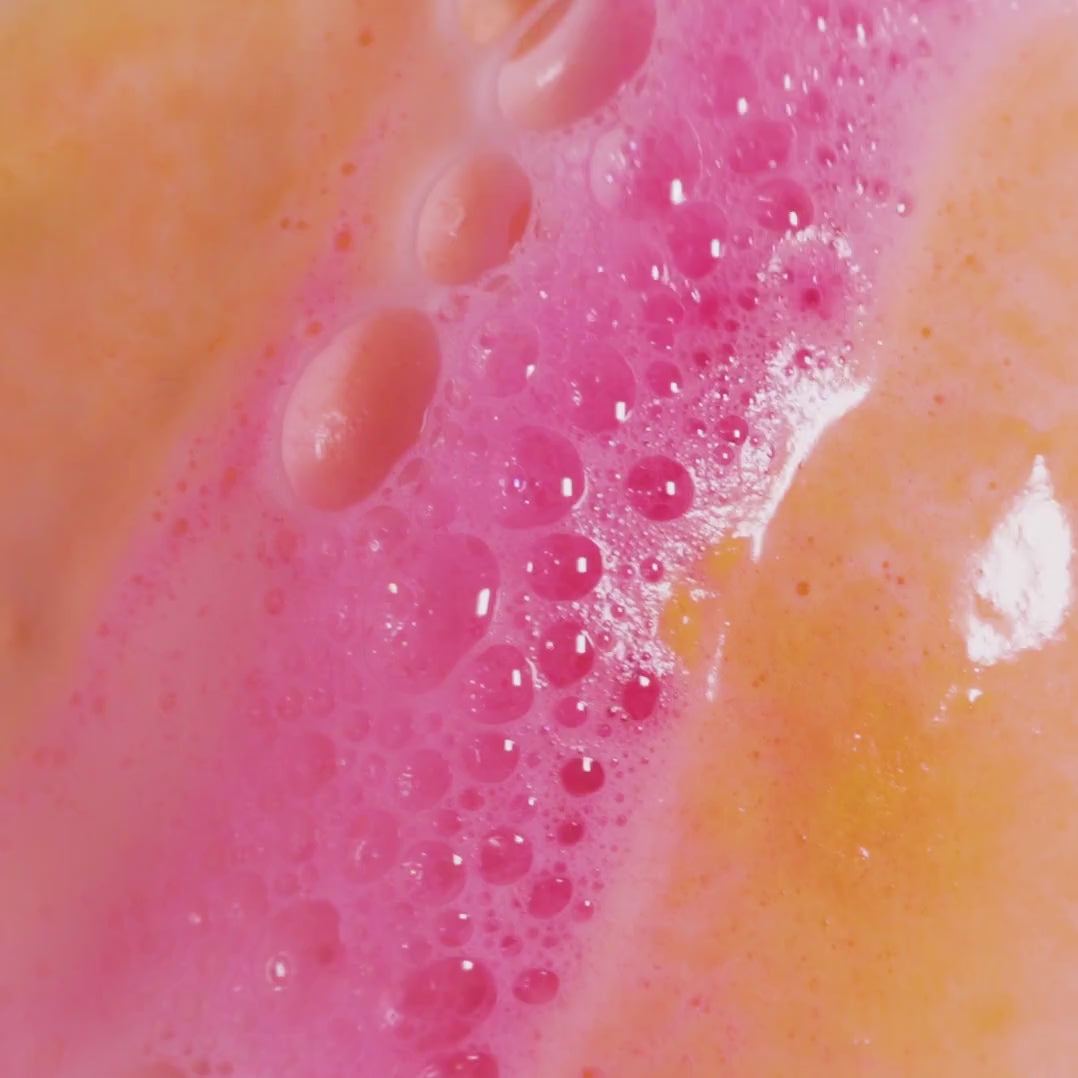 Sodium Bicarbonate, Citric Acid, Citrus Paradisi Peel Oil (grenivkino olje), Artemisia Pallens Herb Oil (olje davane), Canarium Commune Gum Oil (elemi olje), Tagetes Minuta Flower Oil (olje žametnice), Prunus Persica Juice (svež breskov sok), Potassium Bitartrate (vinski kamen), Aqua (voda), Titanium Dioxide, Talc (smukec), Sodium Coco-Sulfate, Propylene Glycol, Dipropylene Glycol, Cocamidopropyl Betaine, Tin Oxide, Synthetic Fluorphlogopite, Alcohol Denat., Geraniol, *Limonene, Parfum, CI 45410:2, CI 15985:1, CI 19140:1, CI 45410:1, CI 42090:2, CI 19140, CI 15850:1, CI 77491, CI 17200